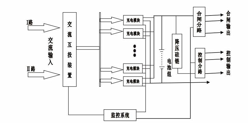 常規直流屏由交流配電模塊、充電模塊、配電監控模塊、降壓硅鏈等零件構成。如圖1為典型的直流屏結構系統。
