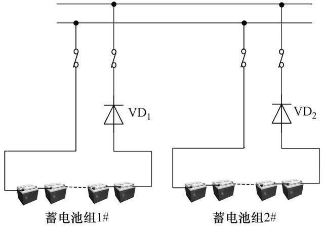 在外部溝通供電異常時,蓄電池組由銜接在直流屏正極與蓄電池組正極之間的大功率二極管VD1/VD2無縫對負載進行供電。放電通道并聯等效電路如圖4所示。在電池組并聯時,即使兩組電池存在電壓差,高電壓蓄電池組與低電壓蓄電池組之間也不導通,不存在充電回路,故防止了環流現象的發生。