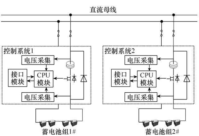 將并聯(lián)保護(hù)器連接至直流屏及蓄電池組之間,由直流屏提供直流輸入,由并聯(lián)保護(hù)器控制蓄電池組的充電電壓及充電電流。每組電池配備相應(yīng)的控制系統(tǒng)進(jìn)行獨(dú)立的充放電管理。為保證在外部交流供電異常時(shí),使蓄電池組能夠及時(shí)對(duì)負(fù)載進(jìn)行供電,在蓄電池與直流母線(xiàn)之間的連接采用單向器件直接連接,以避免放電環(huán)流的影響。
